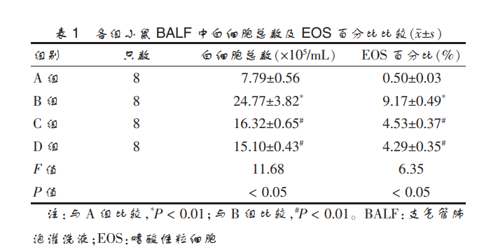 A 組小鼠氣道黏膜無(wú)增厚,氣道周圍無(wú)炎癥細(xì)胞 浸潤(rùn),肺泡壁結(jié)構(gòu)完整;B 組小鼠氣道黏膜充血水腫, 氣道周圍較多炎癥細(xì)胞浸潤(rùn),肺泡結(jié)構(gòu)被破壞;C 組 小鼠氣道周圍少量炎癥細(xì)胞浸潤(rùn),管壁無(wú)明顯增厚; D 組小鼠程度與 C 組小鼠相似。 見(jiàn)圖 1(封四)。2.3 各組小鼠 BALF 中白細(xì)胞總數(shù)和 EOS 百分比的 比較 與 A 組比 較,B 組小 鼠 BALF 中白 細(xì) 胞 總 數(shù) 和 EOS 百分比均顯著升高,差異有高度統(tǒng)計(jì)學(xué)意義(P < 0.01)。 與 B 組比較,C 組和 D 組小鼠 BALF 中白細(xì)胞 總數(shù)及 EOS 百分比明顯降低,差異有高度統(tǒng)計(jì)學(xué)意 義(P < 0.01)。C、D 兩組白細(xì)胞總數(shù)和 EOS 百分比比較, 差異無(wú)統(tǒng)計(jì)學(xué)意義(P > 0.05)。 見(jiàn)表 1。
