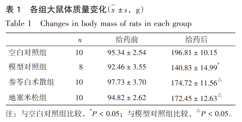 見表 1。各組大鼠 在給藥前體質量無明顯差異,給藥后參苓白術散 組、地塞米松組大鼠生理狀態、哮喘癥狀均好轉, 體質量與模型對照組相比明顯升高,差異有統計學 意義(P<0.05)。