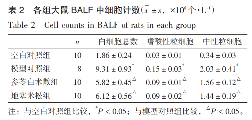 見表 2。模型組 BALF 中,炎癥細胞計數較 空白對照組顯著增多,參苓白術散組和地塞米松組 較模型對照組顯著降低,差異均具有統計學意義 (P<0.05)。