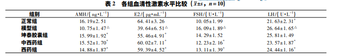 給予雷公藤多苷片的 55 只大鼠呈現(xiàn)不同 程度的動情周期紊亂,表現(xiàn)為延長與停滯。連續(xù)灌胃 2 周 后,46 只大鼠出現(xiàn)連續(xù)動情周期紊亂,造 模 成 功 率 為 83. 6%; 2 周治療結(jié)束后,陰道脫落細(xì)胞涂片顯示 28 只大 鼠動情周期恢復(fù) ( 28 /46,60. 9%) ,其中模型組 3 只 ( 3 / 11,27. 3%) ,西藥組 8 只 ( 8 /11,72. 7%) ,坤泰膠囊組 8 只 ( 8 /12,66. 7%) ,中西藥組 9 只 ( 9 /12,75%) 。與正常組比較,模型組 血清 AMH、E2 水 平 顯 著 降 低,LH、FSH 水 平 顯 著 升 高 ( P<0. 05) ; 與模型組比較,坤泰膠囊組、中西藥組、西藥 組 AMH、E2 水平顯著升高 ( P<0. 05) ,中西藥組、西藥組 FSH、LH 水平顯著降低 ( P<0. 05) 。