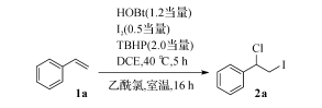 首先筆者采用苯乙烯1a的1-氯-2-碘代反應(yīng)為 模板反應(yīng),對反應(yīng)條件進(jìn)行優(yōu)化。苯乙烯與1.2當(dāng) 量1-羥基苯并三氮唑、0.5當(dāng)量碘單質(zhì),以2當(dāng)量質(zhì) 量分?jǐn)?shù)為70%的 TBHP為氧化劑,在二氯乙烷溶劑 中40 ℃下反應(yīng)5h,隨后與5當(dāng)量乙酰氯進(jìn)一步室 溫反應(yīng)16h,能以45%的收率得到目標(biāo)產(chǎn)物2a。苯 乙烯1a的1-氯-2-碘代反應(yīng)過程為在此基礎(chǔ)上篩選氧化劑、溶劑和氯化 試 劑。氧 化劑對反應(yīng)收率的影響如表1中 序 號1~5所 示。 在沒有氧化劑的情況下,烯烴的1-氯-2-碘代反應(yīng)不 能進(jìn)行。對常見的氧化劑進(jìn)行篩選,發(fā)現(xiàn)過硫酸鉀 和二叔丁基過氧化物對反應(yīng)沒有作用,雙氧水作氧 化劑目 標(biāo) 產(chǎn) 物 的 收 率 達(dá) 到 29%。因 此,最 終 選 擇 TBHP水溶 液 作 氧 化 劑。