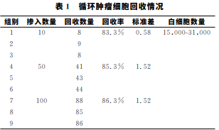 通過 CTC 分離回收效率公式計算標記并染色 的 NCI-H1975細胞回收效率。實驗結果顯示,通過 循環腫瘤細胞滲入實驗,NCI-H1975細胞的回收率 為(83.3-86.3)%,平均值為(85.0±1.5)%(表1)。