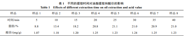 當樣品浸泡在正己烷溶劑中時, 溶解平衡使樣品中 的脂肪含量隨著時間的遞增呈現(xiàn)不同的濃度。因此研究不 同時間段溶劑對樣品脂肪的提取量和樣品脂肪酸價的影響, 對節(jié)省實驗時間具有重大意義。本次實驗分為 8 組, 每組 分別稱取 10 g 樣品于離心管中, 在管中分別加入過量的正 己烷(30 mL)進行震蕩溶解提取, 在 10~45 min 內(nèi)每隔 5 min 測一次酸價和脂肪。最后對測定結果進行統(tǒng)計分析, 見表 1。 由表 1 可知, 隨著浸泡時間的增加, 溶劑中的脂肪含 量增加速率呈現(xiàn)不同變化, 經(jīng)過分析可以將其變化速率分 為 3 個不同的階段。第 1 階段稱之為快速增長期, 在最初 提取的 15 min 內(nèi)由于濃度梯度差很大, 樣品中的脂肪快速 溶解在正己烷溶劑中。第 2 階段為平緩增長期, 在提取的 15~25 min里, 樣品中的脂肪含量已經(jīng)減少, 濃度梯度差變 小, 脂肪含量雖然也增加, 但增加的速度并沒有最初 1 階 段的速度快。第 3 階段為穩(wěn)定期, 在 25~40 min 的時間段, 脂肪含量并沒有增加, 提取含量達到最大值, 提取效果達 到最大化。酸值的變化與脂肪含量的變化呈現(xiàn)平行增長, 因此提取時間達到 25 min 以上時, 酸值趨于穩(wěn)定, 樣品中 不再有新油脂溶解出來, 脂肪的酸價一直保持穩(wěn)定狀態(tài)。 因此樣品經(jīng)過正己烷溶劑浸泡 25 min 后就可以提取完畢, 同比國標方法的常溫靜置浸提(12 h)縮短 96%的時間, 同 比國標方法的索氏提取法(4 h)縮短 89%的時間, 是一種 高效快速的提取方法。