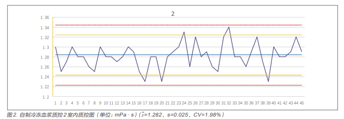 先將SA-7000血流變儀進(jìn)行日常的維護(hù)、清洗和保養(yǎng), 對(duì)血漿黏度做定標(biāo)校準(zhǔn),取上述兩份分別編號(hào)為質(zhì)控1和質(zhì) 控2的自制冷凍新鮮血漿各5mL,二者各重復(fù)測(cè)定20次,經(jīng) 過(guò)統(tǒng)計(jì)學(xué)處理,分別計(jì)算出它們的均值x及標(biāo)準(zhǔn)差s,作為 各自的靶值及靶值范圍。隨后每天取自制冷凍血漿質(zhì)控1和 質(zhì)控2各一支,置于37?C水浴箱中溫浴約15min,使其復(fù)溶 后立即取出。然后二者與當(dāng)天常規(guī)標(biāo)本一同檢測(cè)得出結(jié)果并 記錄。自制室內(nèi)質(zhì)控連續(xù)開(kāi)展45個(gè)工作日并同時(shí)繪制質(zhì)控 圖表,觀察分析結(jié)果。