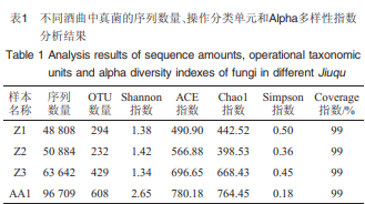 香農(Shannon)指數、ACE指數、Chaol指數、辛普森 (Simpson)指數和Coverage指數是常用于描述微生物群落 物種多樣性的Alpha多樣性指數,這5個多樣性指數可以對 群落物種組成的豐富度及群落物種組成的均勻度進行綜 合性的評價,5個多樣性指數中的Shannon指數對微生物群 落物種多樣性更為敏感。其中,Shannon指數越大,群落物 種的多樣性越高;Chaol指數或ACE指數越大表明群落物 種豐富度越高;由Coverage指數可知本次實驗的取樣是否 合理,若Coverage指數>97%,則證明本次取樣是合理的;但Simpson指數值越大,說明群落多樣性越低。基于高通 量測序技術對濃香型白酒中高溫曲和芝麻香型白酒高溫 曲中真菌的序列數量、操作分類單元(operational taxonomic units,OTU)和Alpha多樣性指數進行研究,結果見表1。