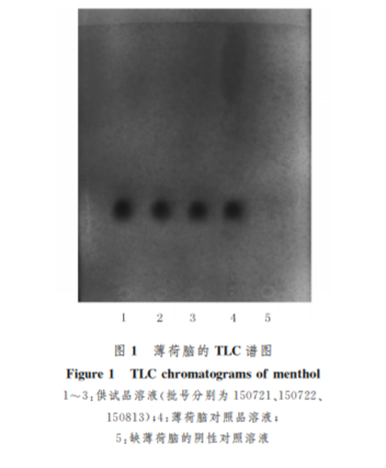 取復方薄荷酚酸酊(批號 150721、150722、150813)適量 作 為 供 試 品 溶 液。取 薄荷腦對照品加甲醇制成濃度為10mg/ml的對照 品溶液。按照制劑處方制備不含薄荷腦的復方薄荷 酚酸酊陰性 樣 品,取陰性樣品適量作為陰性對照。 按2015年版藥典四部 TLC 實驗 操 作 方 法,吸取 上述3種溶液各2μl,分別點于同一硅膠 G 薄層板 上,以甲苯-乙酸乙酯(V∶V=19∶1)為展開 劑,展 開,取出,晾干,噴以5%香草醛濃硫酸-乙醇(1∶4) 的混合溶液,在105 ℃加熱至斑點顯色清晰。在供 試品色譜中,與對照品色譜相應的位置上,顯相同顏 色的斑點,陰性對照色譜無相應斑點,見圖1。 2.2 乙醇含量測定 取1.2項下10個批次的復方 薄荷酚酸酊,各精密量取25ml,置150~200ml蒸 餾瓶中,加水約50ml。按照2015年版藥典四部通則 0711乙醇量測定法第二法蒸餾法,測定樣品中乙 醇的含量,每批次平行測定2份。結(jié)果顯示,樣品中 乙醇的含量為44%~50%,平均 值 為47%,擬定復方薄荷酚酸酊中乙醇的量在42%~52%。