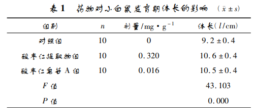 分組后第 1 次測量原始 體長,3 組小白鼠原始體長比較無顯著差異( P > 0. 05) 。實驗用藥 20 d 后麻醉動物,放在臺面上,將 身體拉直,用直尺測定體長,從頭頂端到小白鼠臀尾 交接處即為小白鼠體長,精確到 1 mm。