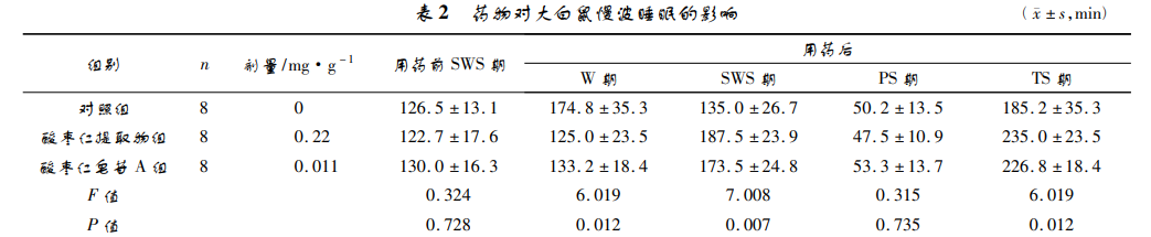灌胃 20 d 后酸棗仁提取物組、酸棗仁皂苷 A 組體長明顯優于 對照組,差異有統計學意義( P < 0. 01) ,酸棗仁提取 物組和酸棗仁皂苷 A 組比較,差異無統計學意義, 說明酸棗仁提取物和酸棗仁皂苷 A 都可以明顯增 加生長發育期小白鼠的體長,兩者作用相當。見表 1。酸棗仁皂苷 A 可以促進大白鼠慢波睡眠時間( P < 0. 05) ,酸棗 仁提取物也可以明顯促進大白鼠慢波睡眠,與對照 組比較,差異有統計學意義( P < 0. 01) ,說明藥物可 以延長慢波睡眠。而兩組對異相睡眠( paradoxical sleep,PS) 期無影響。由于藥物促進了慢波睡眠,所 以用藥組較對照組總睡眠時間明顯延長,清醒時間 減少,而酸棗仁提取物和酸棗仁皂苷 A 比較,促進 慢波睡眠作用相當。見表 2。